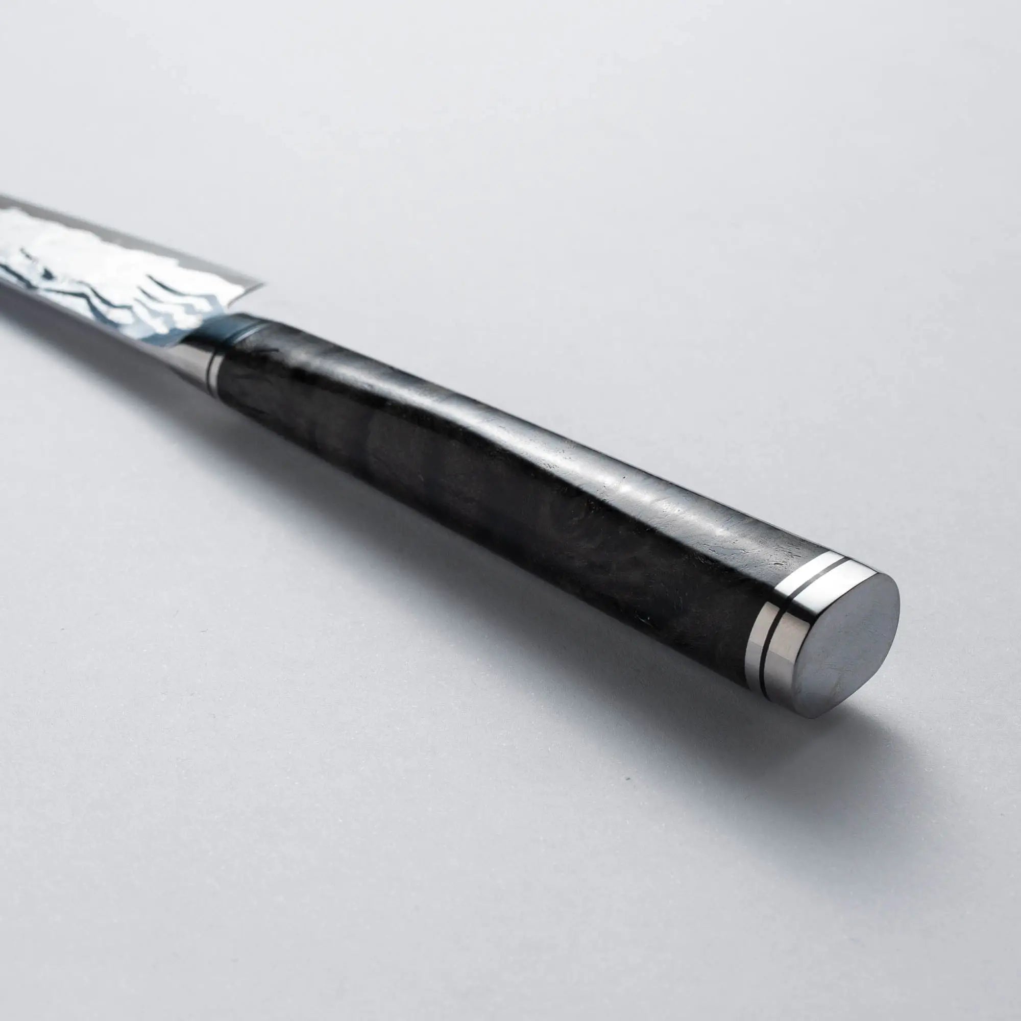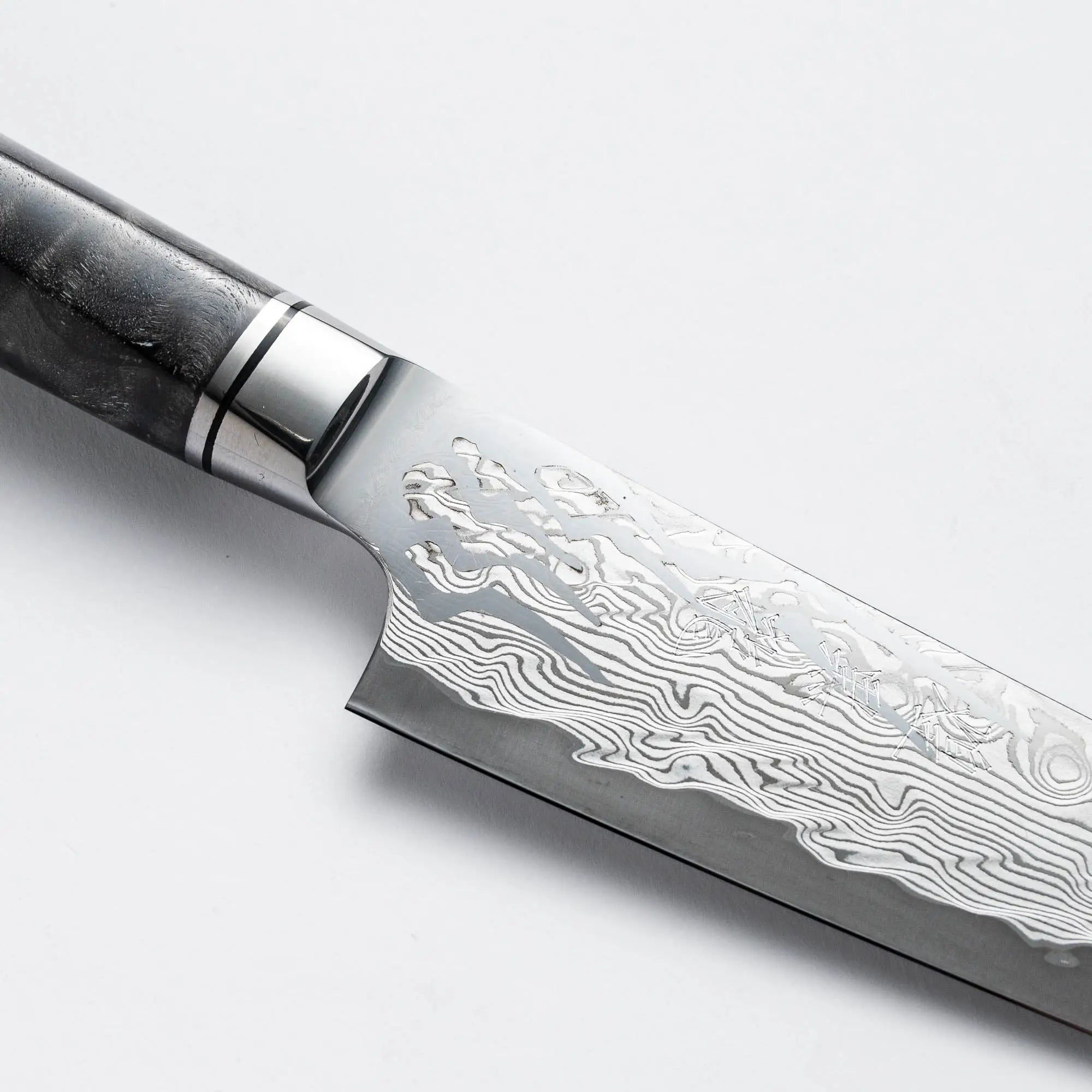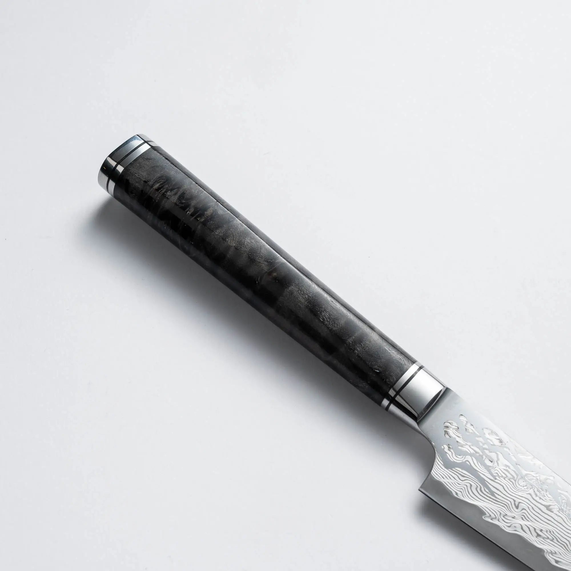A kézzel kovácsolt 99 damaszk réteg, a japán tusfestészet felhő–sárkány mintázatait idézi. A penge és a markolat találkozásánál megjelenő hullámzó vonal a „láng” motívum – a készítő szenvedélyét és a főzés örömét jelképezi.