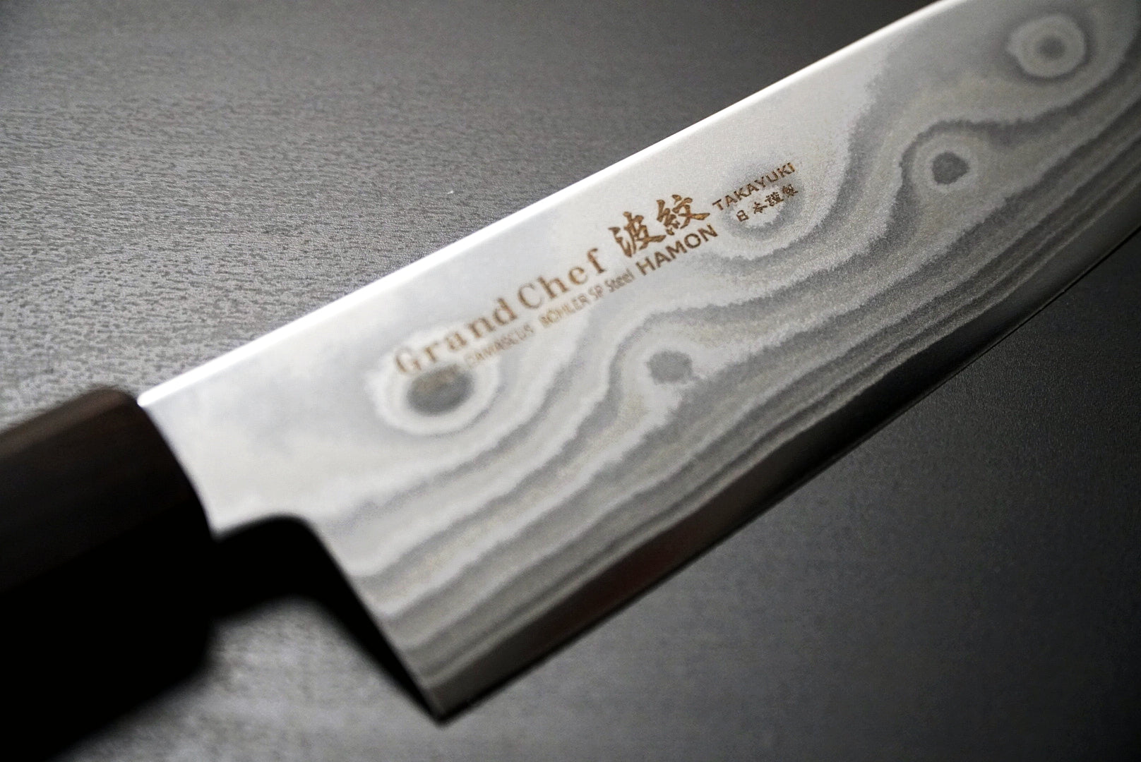 A Sakai Takayuki Grand Chef Hamon szériája Böhler SP acélból van, 45 réteg damaszk. A pávatollra emlékeztető pengéhez egy gyönyörű rózsafa markolat tartozik.